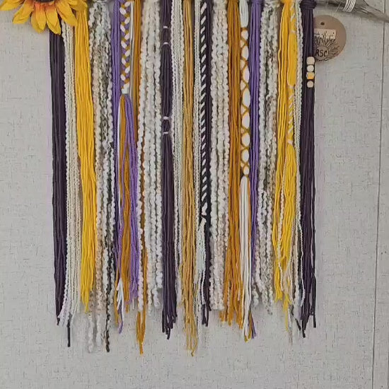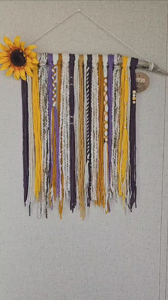 Enhance your space with our beautiful Sunflower Purple Shine yarn wall hanging, measuring 22.5" W by 20.5" L. Handmade with driftwood and featuring complimentary colors, braiding, beading, and an artificial flower. Elevate your decor with this unique and charming piece.